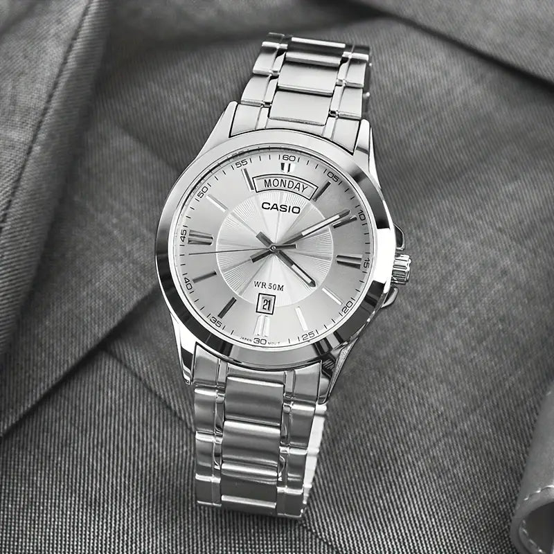 El Casio MTP-1381D-7A representa un reloj clásico con proporciones equilibradas. Su caja de 39.9 mm de ancho se ajusta cómodamente tanto en muñecas medianas como pequeñas, y reúne características útiles como visualización del día de la semana y fecha, movimiento de cuarzo y resistencia al agua de hasta 50 m (5 ATM). Ideal para el día a día o un entorno casual-elegante, con la calidad que distingue a Casio.